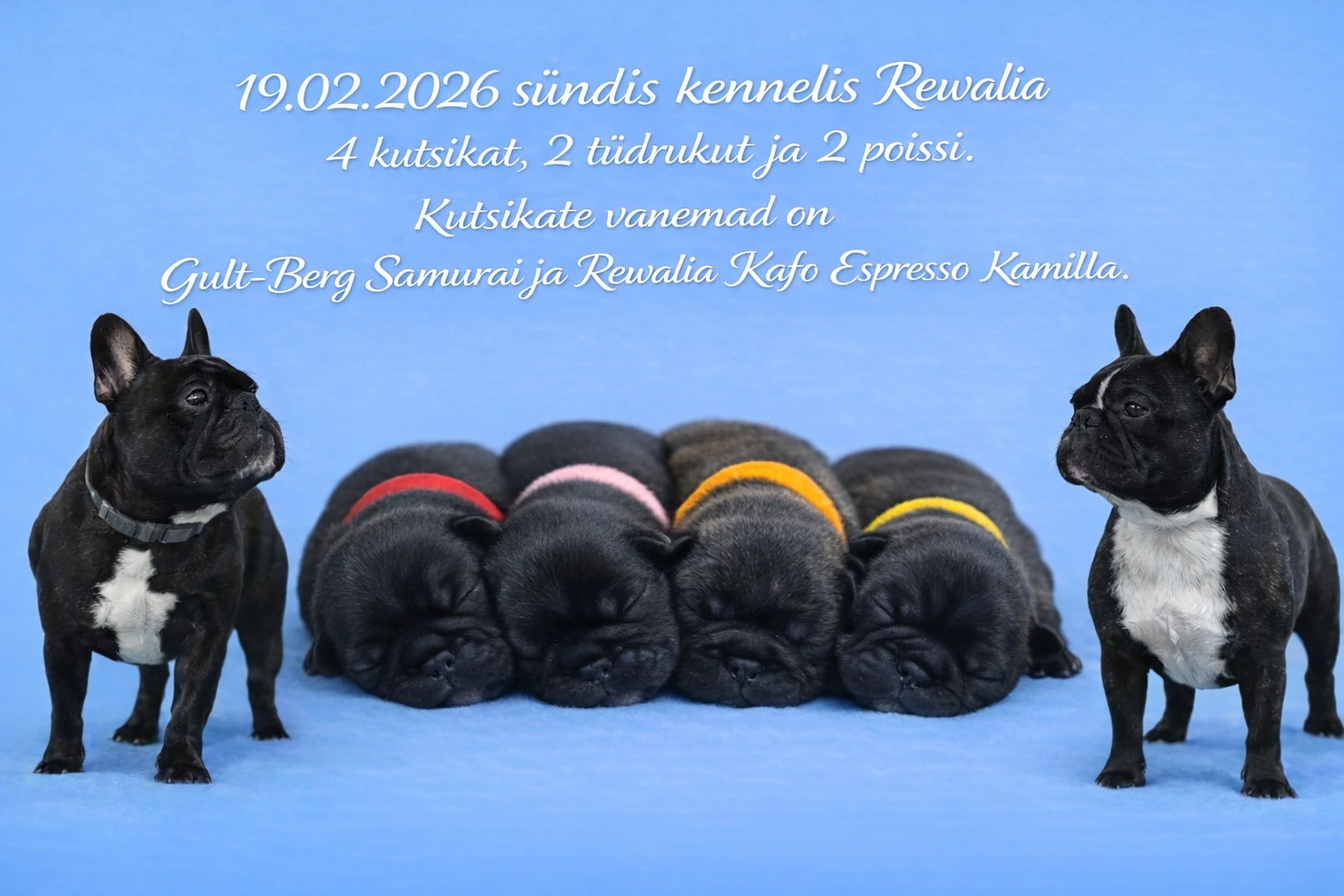 19.02.2026 sündis Rewalia Kafo Espresso Kamilla ja Gult-Berg Samurai paaritusest 4 kutsikat, tumedat brindle värvi, 2 tüdrukut ja 2 poissi.